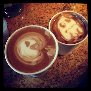 今日のラテ、パックマン登場しました。シアトルの「Fremont Coffee Company」はいつもこんな楽しいラテアート作ってくれます。