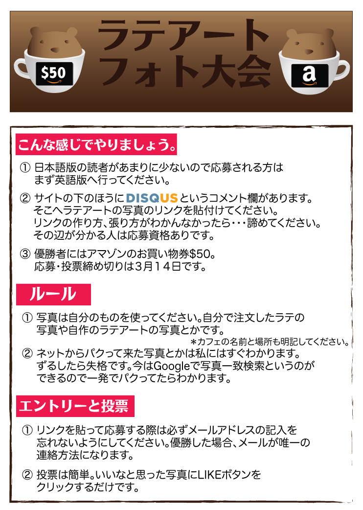 ラテアートフォト大会(賞品:アマゾンの商品券$50!)